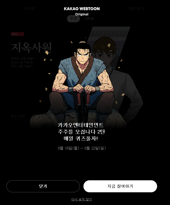 월요일부터 일요일까지 진행하기 때문에. 진짜 간단한 참여방법이다 어서 다들 gogo 하루하루 출석할때마다 주식응모권 1장씩 GET. 오늘은 여러분과 카카오웹툰 퀴즈 정답 8월 24일차 지옥사원 퀴즈 정답을 공유하고자 합니다.